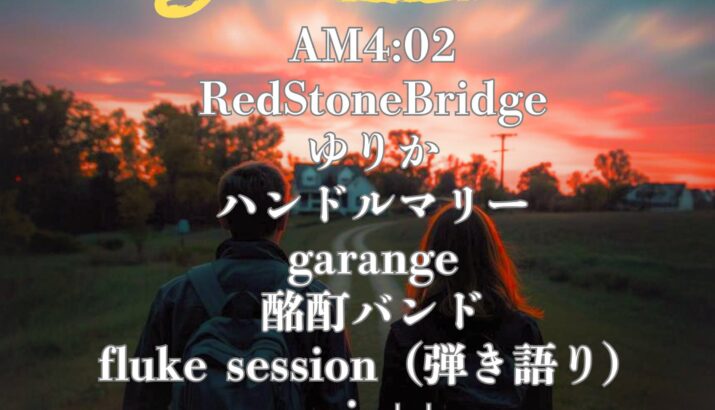 出演:G-OZ / garange / ゆりか / AM4:02 / RedStoneBridge / ハンドルマリー / 酩酊バンド / asia++ / fluke session(弾き語り)
